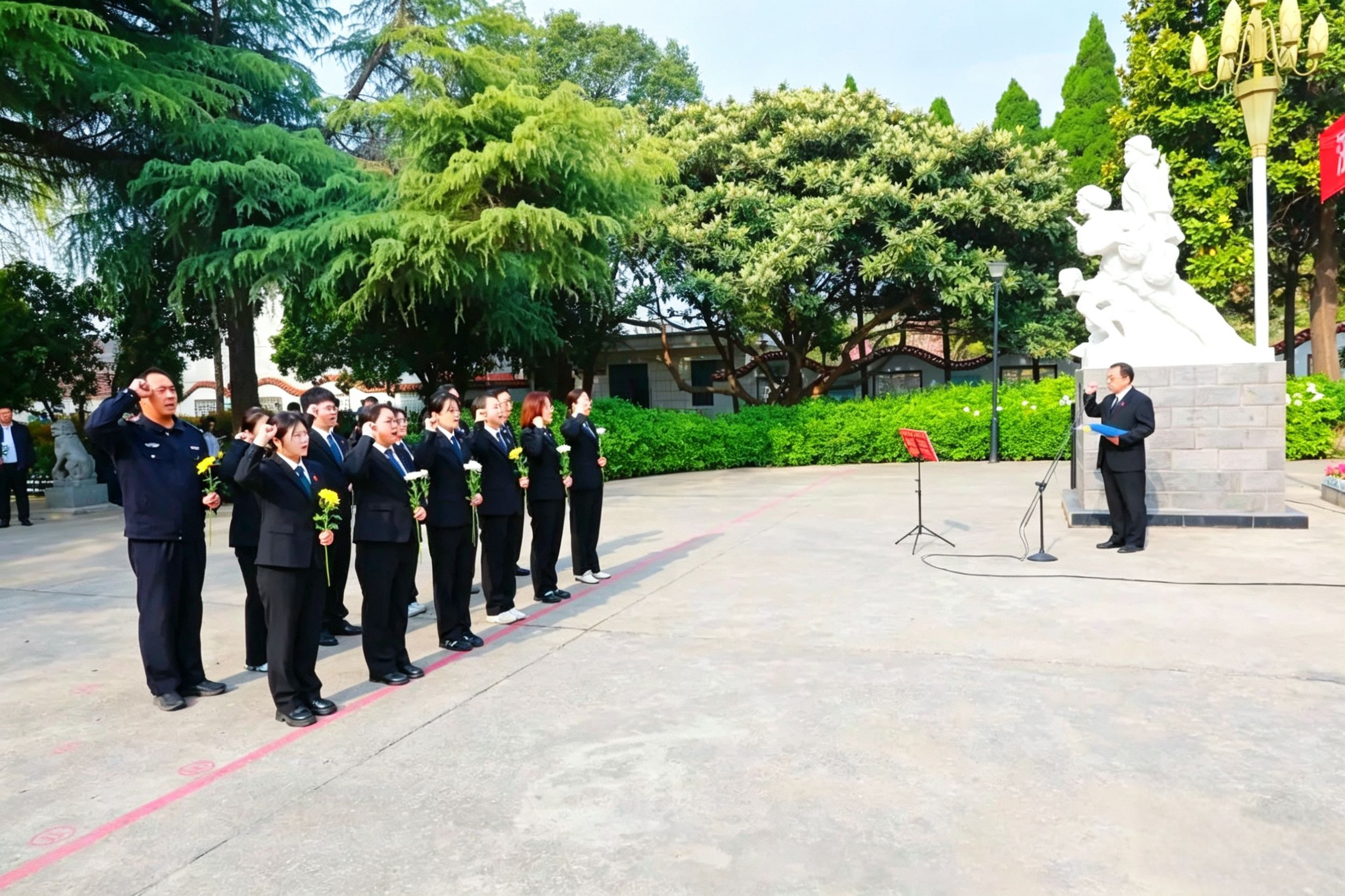 在烈士纪念碑前,干警代表身着正装列队肃立,表达对英烈的深切缅怀与崇高敬意。随后,干警代表们举起右拳,庄严重温入党誓词,铿锵有力的誓言回荡在陵园上空,既是对革命先烈的告慰,也是对自身使命的重申。宣誓结束后,全体人员垂首默哀,向英勇捐躯的先烈致以最深切的哀思。默哀毕,干警们手持鲜花,缓步上前献于碑前,以鲜花寄哀思,致敬英烈忠魂。
